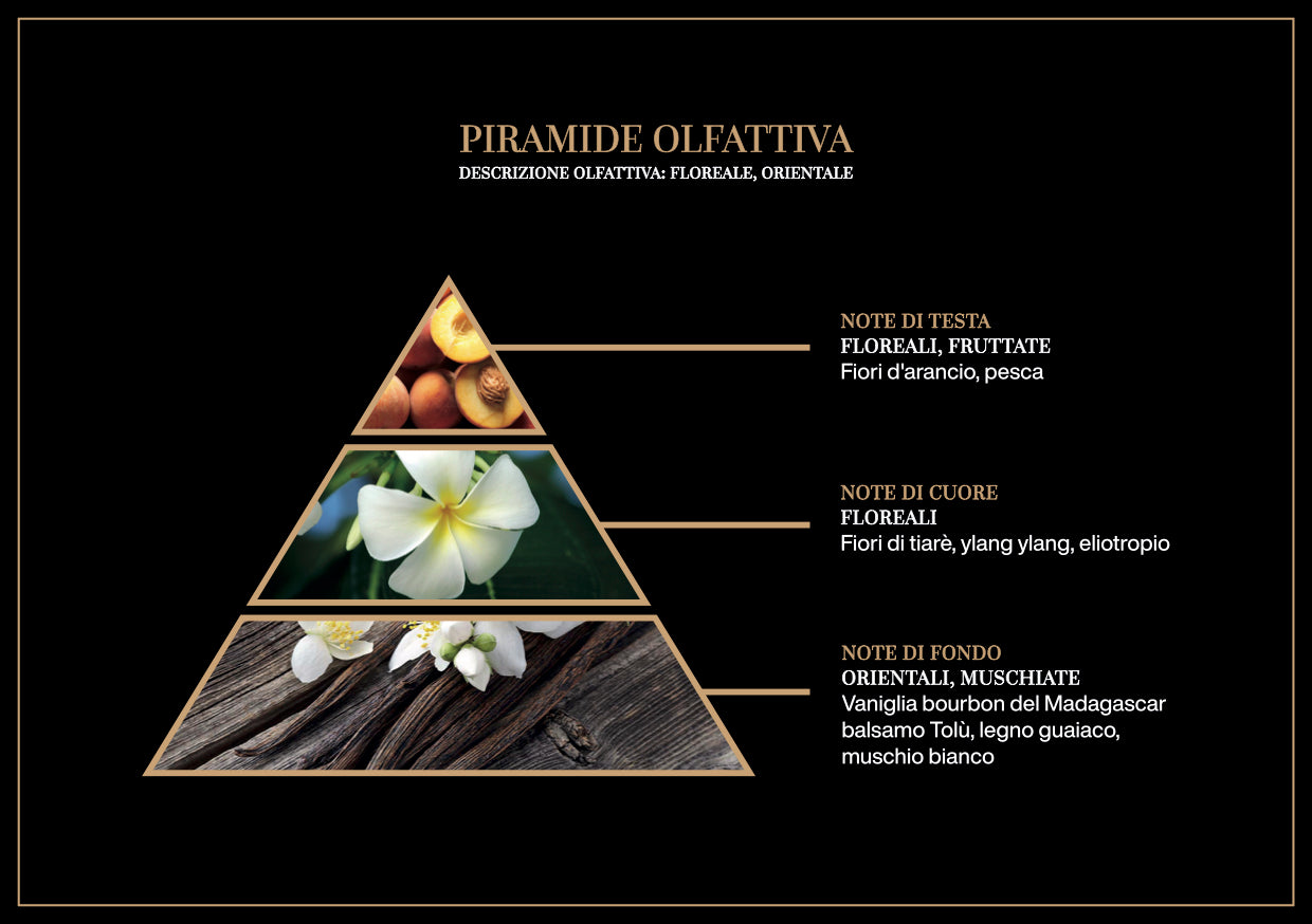 Un profumo misterioso ed esotico, che svela le emozioni e i sentimenti più intimi della nostra storia. Le note prorompenti dei fiori di Tiaré insieme a quelle della pesca, dei fiori d'arancio, dell'ylang ylang e dell'eliotropio, incantano l'olfatto e vi trasporteranno in un luogo mistico e incantato come l'Estremo Oriente. Arricchito da muschio bianco, dalla preziosa vaniglia bourbon del Madagascar, dal balsamo del Tolù e dal pregiato e persistente legno guaiaco, questo profumo seduce per un piacere profondo e avvolgente che si sposa perfettemante con ogni ambiente.
